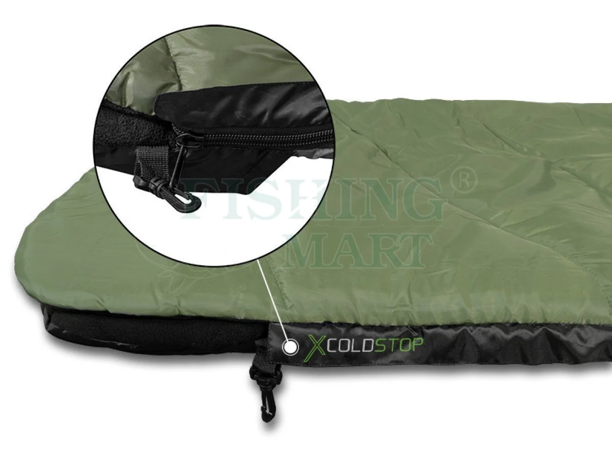 Do wnętrza śpiwora dostaniesz się z obu stron, ponieważ posiada on zamki błyskawiczne z prawej i lewej strony. Dzięki temu będziesz mógł ustawić swoje łóżko wędkarskie po dowolnej stronie namiotu i szybko z niego wyskoczyć gdy usłyszysz alarm brania. Przegroda zamka błyskawicznego COLDSTOP po obu stronach zapobiega przedostawaniu się zimnego powietrza do wnętrza śpiworu. Dodatkowo, zamki błyskawiczne są wyposażone w plastikowy klips po każdej stronie, aby łatwiej było je rozsuwać i zasuwać.